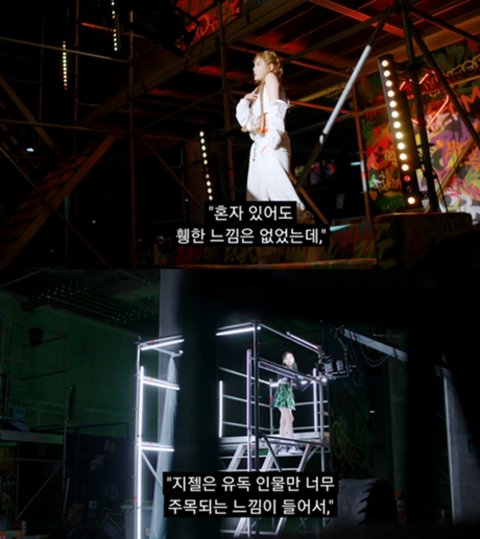 지젤만 좁고 위험한 계단에서 아무것도 없는 휑한 배경 바탕으로 찍음