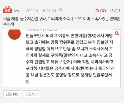 이 댓글이 제일 어이없음ㅋㅋㅋㅋㅋㅋㅋㅋㅋㅋㅋㅋㅋㅋㅋㅋㅋㅋㅋㅋㅋㅋㅋㅋ 이름개명이 어때서 ㅋㅋㅋㅋㅋㅋㅋㅋㅋㅋㅋㅋ 금수저는 프리지아가 오히려 아니라고 언급했고 ㅋㅋㅋㅋㅋㅋ 트리마제 근거 ㅈ도 없는 루머일뿐이고 소속사있는 연예인 준비생 이지랄 하는데ㅋㅋㅋㅋㅋㅋㅋㅋㅋ 그리고 맞다고 해도 그게 어때서 ? 프리지아만 유튜브 시작할때부터 회사끼고 한것도 아닌데 그게 대체 왜 까일 문젠데 ㅋㅋㅋㅋㅋㅋㅋㅋㅋ 프리지아가 짝퉁 논란 인정 하고 사과 했고 니들은 제발 말도 안되는 헛소문들 가져와서 억까하지나마 그저 가지지 못하고 열등감에 가득찬 년들이 이때다 싶어서 까내리고 열폭하는게 ㅈㄴ어이없고 불쌍하고 웃김