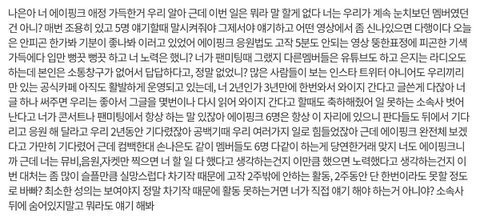 나은아 너 에이핑크 애정 가득한거 우리 알아 근데 이번 일은 뭐라 말 할게 없다 너는 우리가 계속 눈치보던 멤버였던건 아니? 매번 조용히 있고 5명 얘기할때 말시켜줘야 그제서야 얘기하고 어떤 영상에서 좀 신나있으면 다행이다 오늘은 안피곤 한가봐 기분이 좋나봐 이러고 있었어 에이핑크 응원법도 고작 5분도 안되는 영상 뚱한표정에 피곤한 기색 가득에다 입만 뻥끗 뻥끗 하고 너 노력은 했니? 너가 팬미팅때 그랬지 다른멤버들은 유튜브도 하고 은지는 라디오도 하는데 본인은 소통창구가 없어서 답답하다고, 정말 없었니? 많은 사람들이 보는 인스타 트위터 아니어도 우리끼리만 있는 공식카페 아직도 활발하게 운영되고 있는데, 너 2년인가 3년만에 한번와서 와이지 간다고 글쓴게 다잖아 너 글 하나 써주면 우리는 좋아서 그글을 몇번이나 다시 읽어 와이지 간다고 할때도 축하해줬어 일 못하는 소속사 벗어난다고 너가 콘서트나 팬미팅에서 항상 하는 말 있잖아 에이핑크 6명은 항상 이 자리에 있으니 판다들도 뒤에서 기다리고 응원 해 달라고 우리 2년동안 기다렸잖아 공백기때 우리 여러가지 일로 힘들었잖아 근데 에이핑크 완전체 보겠다고 가만히 기다렸어 근데 컴백한대 손나은도 같이 멤버들도 6명 다같이 하는게 당연한거래 맞지 너도 에이핑크니까 근데 너는 뮤비,음원,자켓만 찍으면 너 할 일 다 했다고 생각하는건지 이만큼 했으면 노력했다고 생각하는건지 이번 대처는 좀 많이 슬플만큼 실망스럽다 차기작 때문에 고작 2주밖에 안하는 활동, 2주동안 단 한번이라도 못할 정도로 바빠? 최소한 성의는 보여야지 정말 차기작 때문에 활동 못하는거면 너가 직접 얘기 해야 하는거 아니야? 소속사 뒤에 숨어있지말고 뭐라도 얘기 해봐