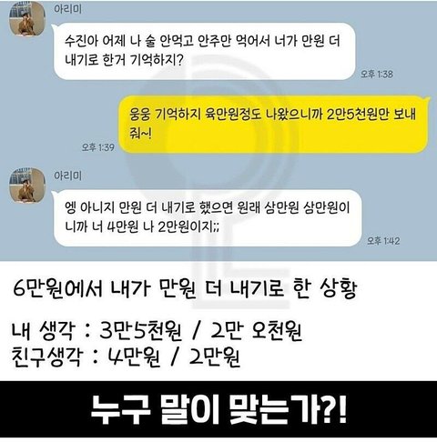 6만원 1/n이면 3만원씩 거기에서 만원 더 내기로한 친구가╋만원이니 총 4만원:2만원