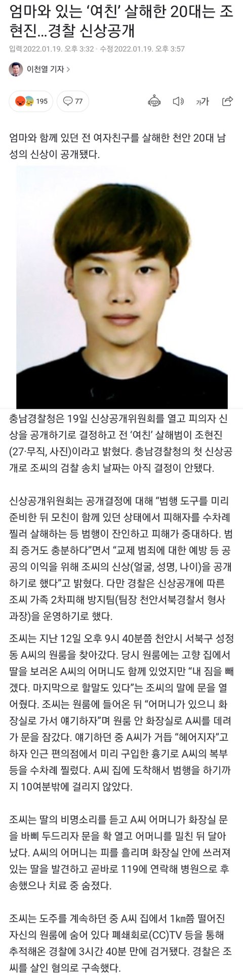 천안 여자친구 살해범 조현진 신상공개 결정됐음!!