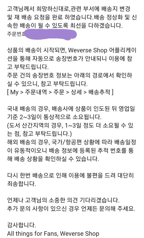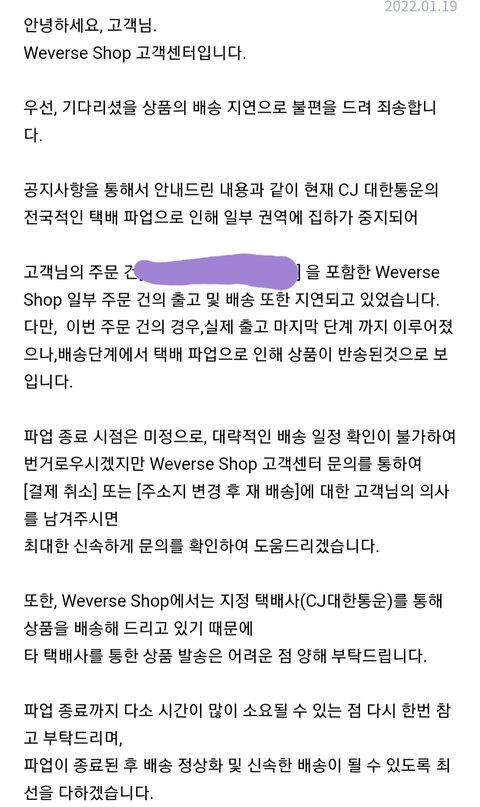 우리 지역이 파업 지역이라 앨범 반송되서 문의해봤는데, 결론적으로 '결제 취소' 혹은 '배송지 변경' 만 가능해. 스냅스처럼 임시보관 해줬다가 재발송은 안된단 소리야.