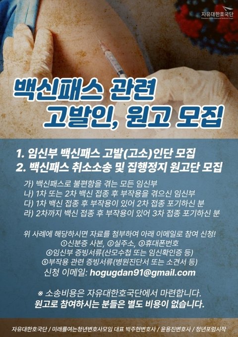 긴급]백신패스 관련 고발인, 원고 모집- 자유대한호국단