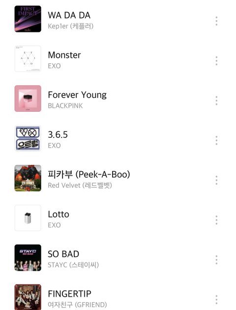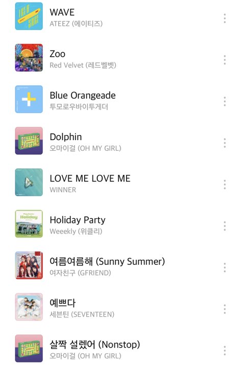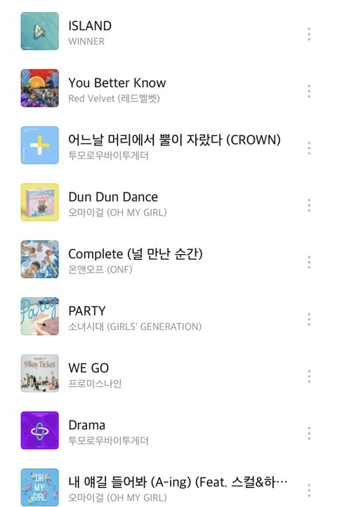 투바투 툽 투모로우바이투게더 레드벨벳 엑소 에프엑스 써니힐 위클리 온앤오프 오마이걸 여자친구 에이티즈 위너 세븐틴 프로미스나인 에스에프나인 에셒구 엔드림 엔시티 엔하이픈 데이식스 원어스 러블리즈 소녀시대 케플러 블랙핑크 스테이씨 아이브 케이팝 스엠 빅히트 제왑
