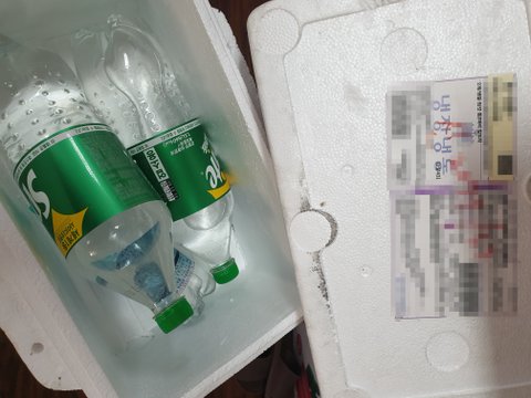 택배는 아이스박스 아래가 아예 깨져서 테이프로 덕지덕지 붙여서 왔고.
