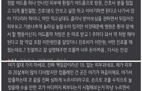 쓰니) 아니... 저도 피부과 20살때부터 지금 서른 앞두기까지 피부과 참 많이 다녔지만, 뾰루지가 올라왔던것도 아니고 피지를 압출하는데 이렇게 환자가 코를 일주일간 못 만질 정도로 압출하진 않던데요..?