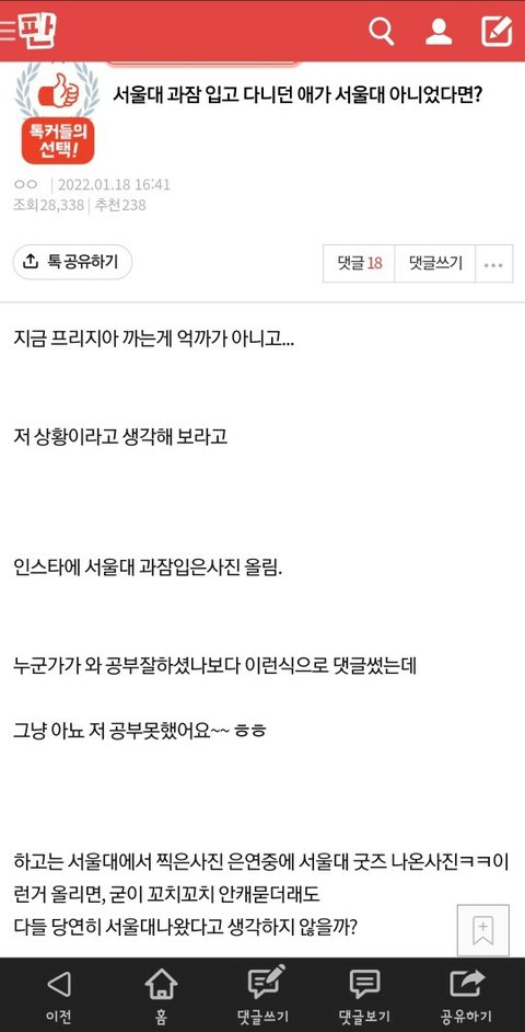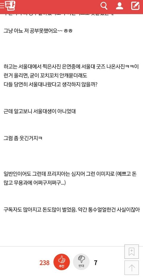 프리지아도 유튭으로 보이는 외관상 털털하고 이런 평판에도 ㅎ; ㅈ까라10새들아 이럼서 모든거 다 인정하고 다른유튜버마냥 잘 지낼줄 알았는데 역시 서울대 과잠은 서울대 과잠일뿐.... 속은 그저 일반인들과 다를 바 없었네 이게 가장 큰 의외다.