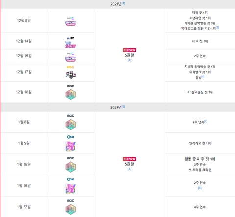 다음주 음중도 유력해서 5주연속으로 2021년 생긴 음중 명예졸업제도 방탄 버터에 이어서 두번째로 음악중심 명예졸업 가능했는데 설특집 결방으로 아쉽.... (음중은 2개월 이내의 곡만 1위후보가능)