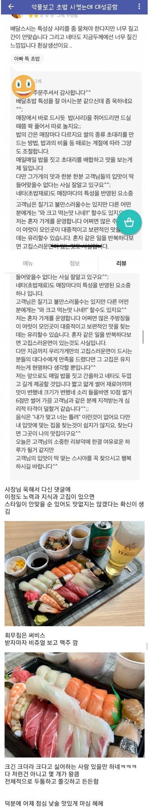 근데 저게 악플임? 걍 개인 입맛같은데 물론 초밥 엄청 맛나보이긴 하고 본인은 네타 두툼한 생선 좋아함