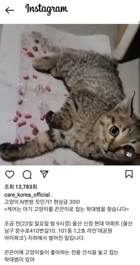 인스타그램 케어 게시글에는 “고양이 간식을 놓았다는건 확실히 쥐를 잡으려는 목적이 아니다”(yujoo****), “울산 남구는 공공기관에 길고양이 급식소가 설치돼 있는 지역구로 알고 있다. 민원을 넣어야 한다”(lee****) “불쌍해서 눈물이 난다. 추운날 간식이라도 먹으려고 아기고양이가 갔을텐데”(kym****) “잔인함의 한계는 없는건가”(iaro****) 등의 댓글이 300개가 넘게 달렸다.