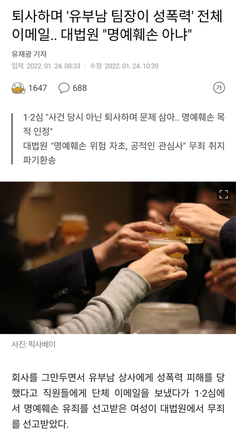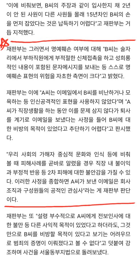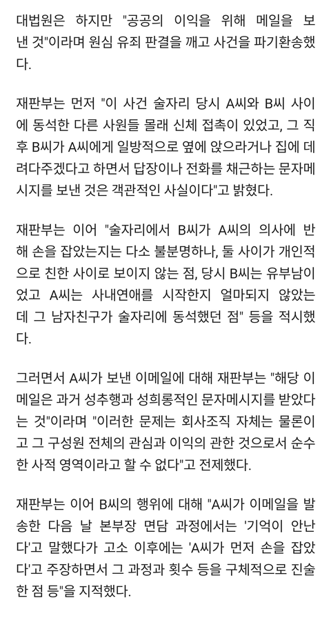 그러니까 성폭력 피해를 당한것과 별건으로 책임을 물어야 하는데 재판부는 "둘 사이가 친하게 보이지 않는다"던가 "a씨가 사내연애를 시작한 지 얼마 되지 않은 점"같은 사적인 전후사정을 들어가며 자력구제를 용인하고 있는겁니다.