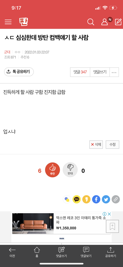ㅅㄷ 방탄 컴백 얘기 할 사람