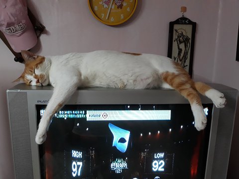 예전에 쓰던 브라운관 티비 캣타워를 도칠이가 좋아했었음.