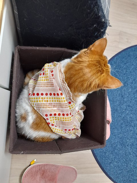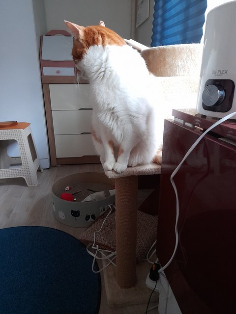 본인이 좋아하는 분리된 캣타워에서 무서워하며 쳐다만 보고 있음.