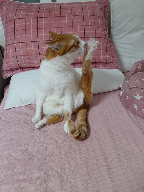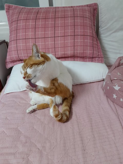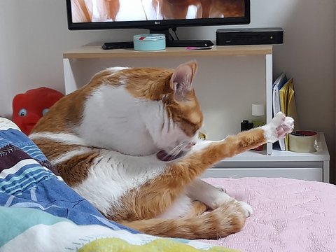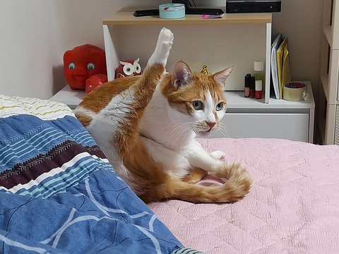 집사자리에 누워있는 집사를 쫓아내고 본인이 몸단장중임.