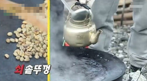 왜냐면 커피콩을 솥뚜껑에 볶고,