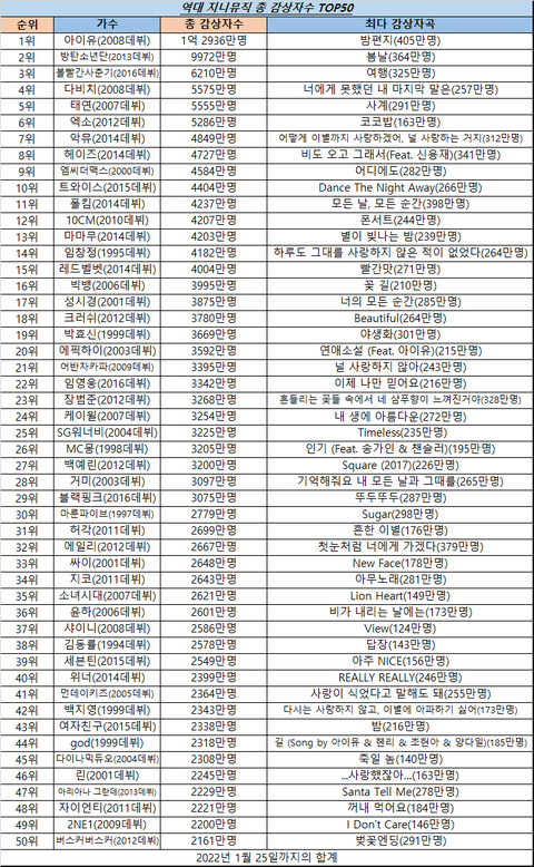 최다 감상자곡 : 첫눈처럼 너에게 가겠다(379만명)