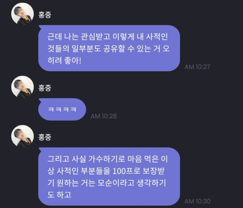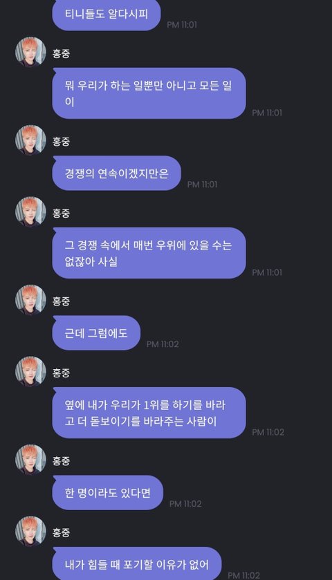 난 진짜 얘만큼 완벽한 아이돌 마인드에 멘탈 가지고 있는사람 처음봄.. 이쁨받는거 좋아하고 일에 대한 욕심도 많고 자존감도 높고 자기가 하는일에 프라이드도 높음 그리고 팬들의 마음을 진짜 다 꿰고 있음 팬들이 뭘 원하고 좋아하는지를 알아 진심 본문이에 있는 내용은 빙산의 일각임 홍중이 프메하면 저런 내용 매일매일 보내줌..