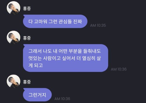 오 지나가던 타팬인데 저 짧은 메세지에서 되게 바르고 순수한 마음이 묻어나온다. 어느 부분이 들춰져도 멋있게 보일수있도록 열심히 산다 이런 말 진짜 쉽게 나오는게 아닌데. 저 친구도 시간이 지나 저 마음이 더 빛을 발하는 때가 왔으면 좋겠네. 팬들에게 사랑받는것에 대해 말하기보다 팬들이 사랑받는 느낌을 가졌으면 좋겠다니 말 너무 예쁘게 해서 감탄하고 감.