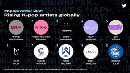 이외에도 아이브, 크래비티, 위아이, 원어스, CIX 등 다양한 아티스트가 라이징 K팝 아티스트 톱10에 이름을 올렸다. 2021년 12월 31일 기준 지난 3년 내에 데뷔한 그룹들의 트윗량을 분석한 결과다.