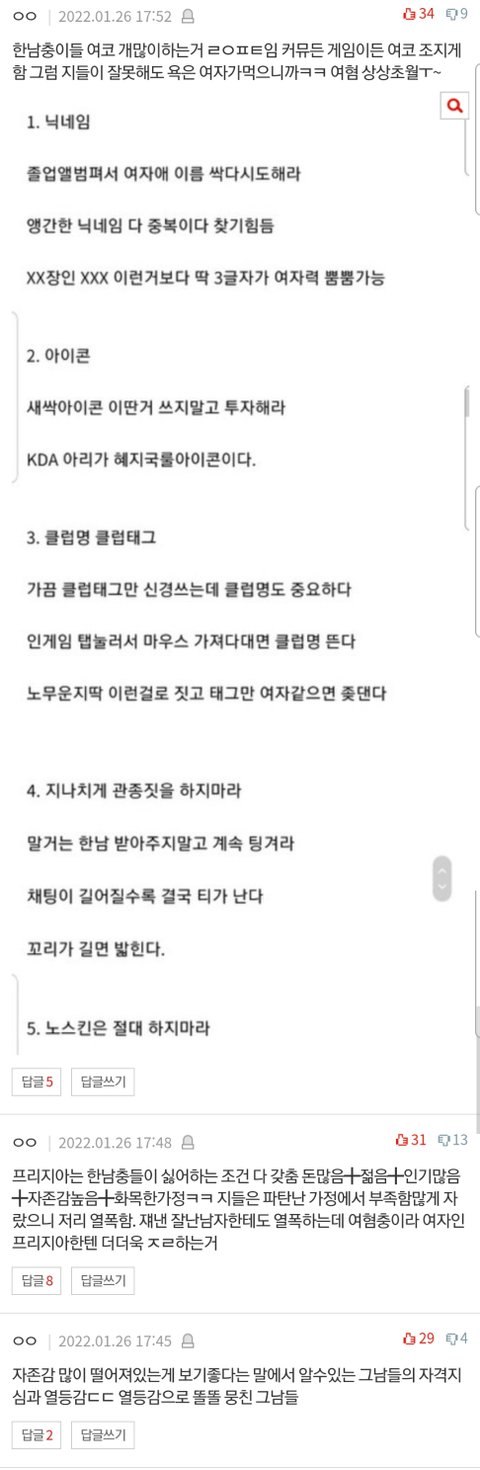 맨날 여자들이 질투심하다 여적여 심하다 이러면서 막상 지들이 시기질투열폭 오지고 그거 들키기 싫으니까 여자인척 하면서 악플달고다님+여적여드립 치면서 더블여혐함. 이게바로 그남들이 열등감 푸는 방식임ㅇㅇ