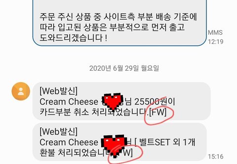 그리고 2020년 6월 29일에 온 메세지 쇼핑몰과 카드사에서 보낸 메세지가 아니며 이것도 마찬가지로 끝에 [FW]가 있음. 이문자도 쇼핑몰과 카드회사에서 보낸 메세지가 아니리고 함.
