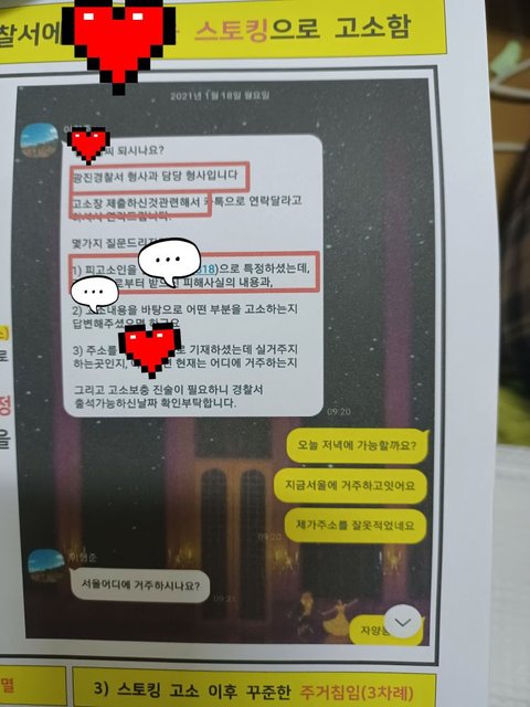 피해자는 먼저 usb에 증거를 담아 제출하였으나 경찰서 pc자체를 해킹한것인지 경찰이 증거가 하나도 보이지 않는다고 했음.그래서 피해자는 해킹, 스토킹 증거영상, 음성파일등을 담당형사의 카카오톡으로 보냄