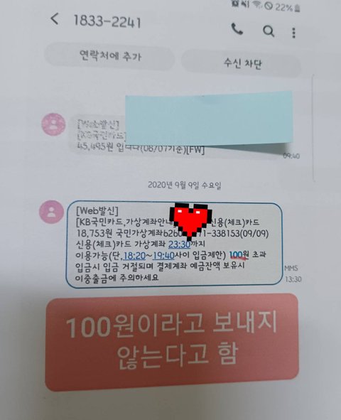 이건 스토킹증거 중 하나인데 국민은행, 국민카드 본사에 찾아가서 물어봄. 100원이라 적힌 문자를 보내지 않으며 길게 늘어진 문구들 또한 은행,카드사에서 절대보내는 문자가 아니리고 함. 이런식으로 피해자를 스토킹으로 괴롭힘