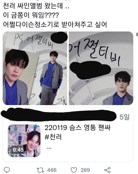 귀엽지 않아?? 저 영통팬싸가 팬분이 첝러한테 구워버린다 유행된거 아냐구 어쩔천러도 유행시켜도 되냐고 하니까 첝러가 어쩔첝러는 좀 그렇고 너무 많이 만들면 퍼(?커?터? 잘 못들었어..)지니까 지나고나서 새로운거 만들자고 했는데 앨범엔 이케 써서 보낸거임ㅋㅋㅋㅋㅠ 귀요미..