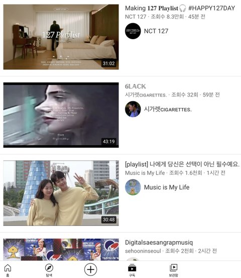 정각에 뜰지 안 뜰지 잘 모르니까 도키도키하면서 훓어보는데 127 말고는 구독 목록이 거의 다 플레이리스트란말야 그래서 올려준거 넘 평소랑 위화감이 없어서 올라온거 인지하는데 한참 걸림ㅋㅋ너무나 흡사한 무드
