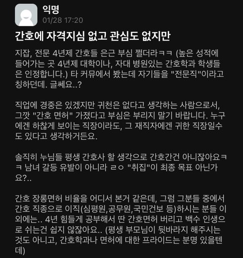 울산 지전문안데 새내기나 그럴 일은 없겠지만 오실 분을 대비해서 .. 정말 노답이야 같은 학우들이고 성적이 나쁘든 좋든 간에 폄하하고 직업에 귀천을 따져서는 안된다고 생각하는데 에타 자체를 남학우들이 많이 해서 그런지 이 글 뿐만 아니라 대다수의 학생이 오히려 글쓴이보다 간호학과/간호사를 나무라고 있음 간호조무사니 취집이나 한다 기어오르지마라 나댄다 이 똥오줌이나 치워라 라는 인식 가지고 있어 물론 이 사람들이 일부 일 순 있겠지만 솔직히 환대 받고 대우 받는 직업은 절대 아니야.. 안 왔으면 좋겠다