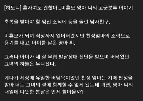 미혼모 영아씨의 고군분투 이야기인데 안타깝다...
