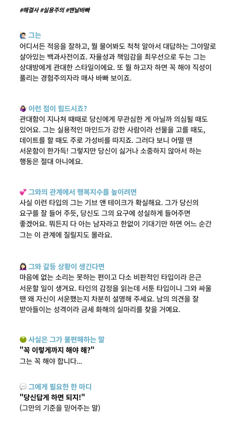 그래서 아예 내가 알 수 있는 범위에서 답안지를 택해서남편 MBTI 성향을 알아보고, 남편과의 관계에 대한 솔루션까지 알아 볼 수 있음 좋겠다 싶어서이번에 직접 기획해서 테스트를 만들어 주위에 돌려봤는데 소름돋게 잘 맞는다며 좋아하더라구요.