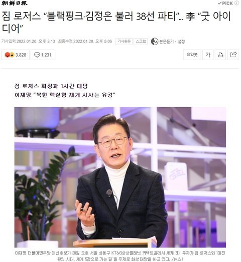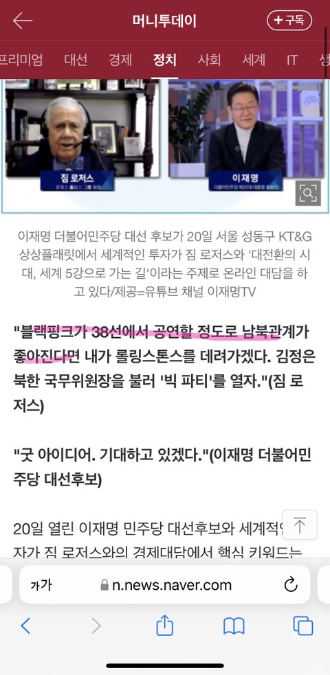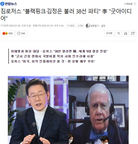 >이재명 : 블핑 김정은 불러서 같이 38선에서 큰 파티 열자는 짐 로저스의 제안에 "굿 아이디어"라고 응답