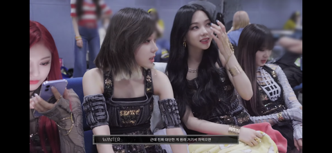 저기 뒤에 빨간줄무늬 입은 사람이 로켓펀치 다현이고 윈터 카리나가 모니터로 보고 있는 가수들이 우아?라는 그룹이래 그 에셈 전연생 두명 있는 그룹.. 로켓펀치 다현도 에셈 전연생이었음 개신기