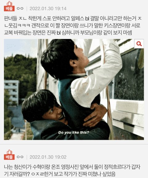 베플도 ㄹㅇ 둘이 껴안고 좋냐 이러는거라서 ㄹㅇ bl인줄 알고 둘이 수혁이랑 청산이랑 키스하는 장면? 같이 옷 벗고 서로 피 닦아주는 장면 있다길래 1화부터 10화까지 쭉 봤는데