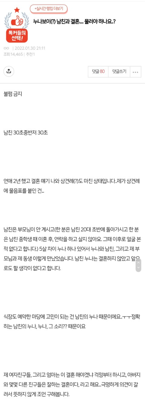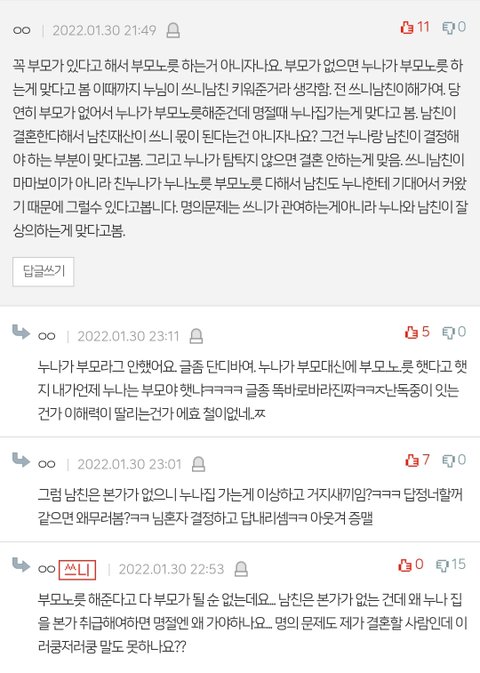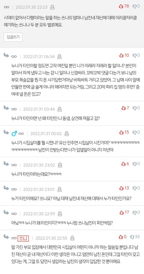 주작 아니고 실화라서 펑한거야 설마?? 진짜 미친 거 아닌가??? 현시세 20억짜리 아파트를 준다는데 뭐가 아니꼬와서 문제고 친정부모님 목돈 들고 계시라고 배려까지 해주는데 그게 또 왜 문제고ㅋㅋㅋㅋ 저 남매는 문제가 없고 쓰니 아버지조차도 괜찮은데 쓰니랑 쓰니엄마가 쌍으로 돌았네.. 돌았어.... 이거 꼭 누나분이 봐서 결혼 엎길 바람