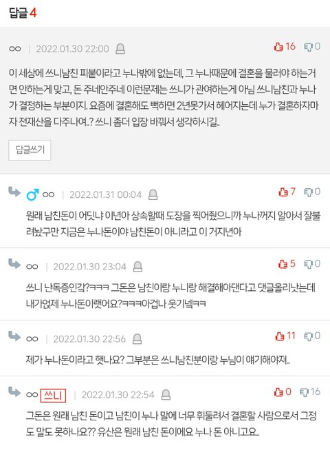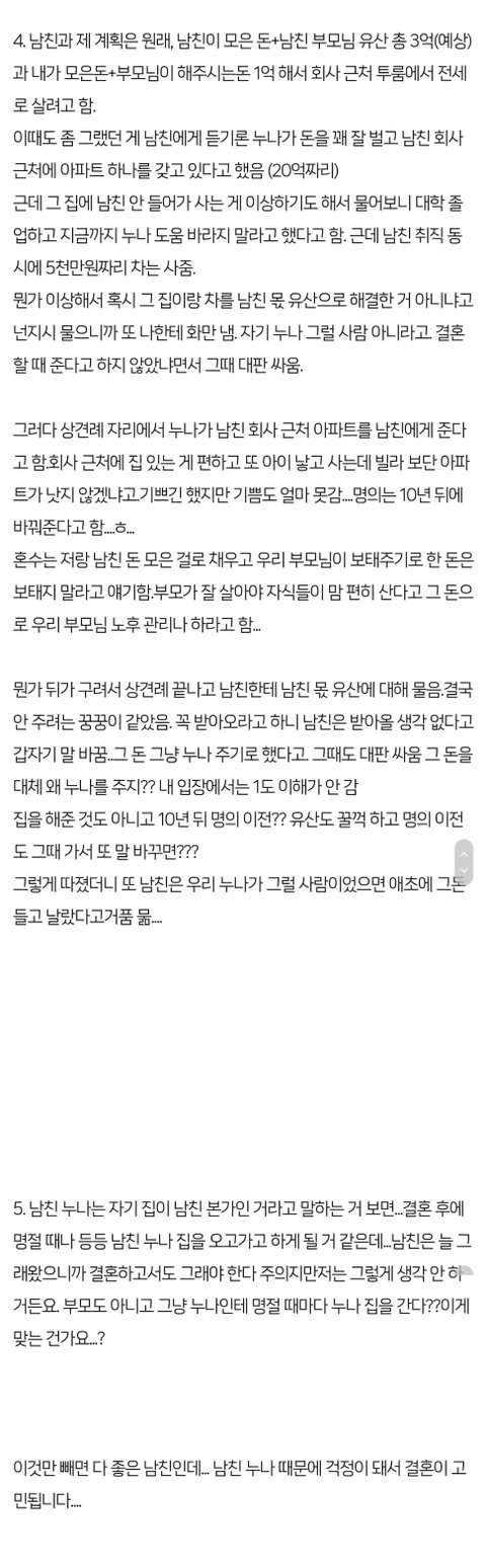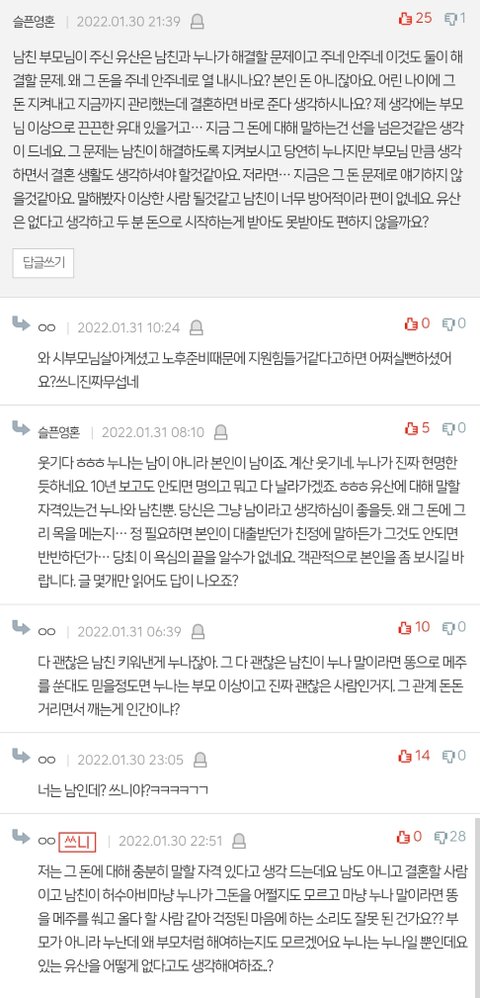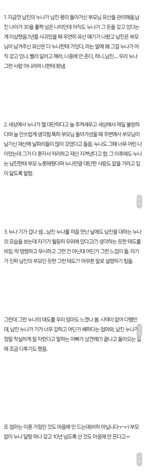 오... 꼭 그 남자분이나 누님이 보셨으면..... 남친의 살아온 삶이나 두 사람의 유대감에 대한 이해가 전혀 없고 일단 유산은 우리꺼 이것밖에 사고가 안되시는 거 보니/ 거의 소시오패스급인데.... 이런 여자가 내 아이의 엄마가 된다는 거, 내 삶의 반려자가 된다는 거 정말 지옥이예요.