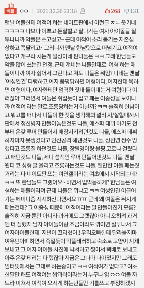 한남들도 여자 욕 잘하는거 누가 몰라 ㅋㅋ 근데 여적여만 유독 주목받는 이유가 뭐겠니 여기 다 나와있으니까 정독해봐 이거 보고도 이해 못하면 니 지능문제임