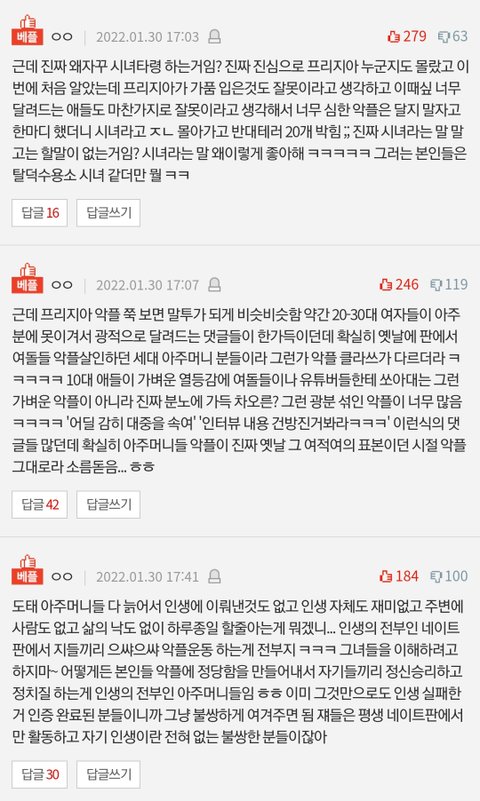 아몰랑 우리 한남들은 죄 없어 프리지아 까는거 다 여자야 악플다는거 다 한녀야!! 여적여라고!ㅋㅋㅋㅋㅋㅋ