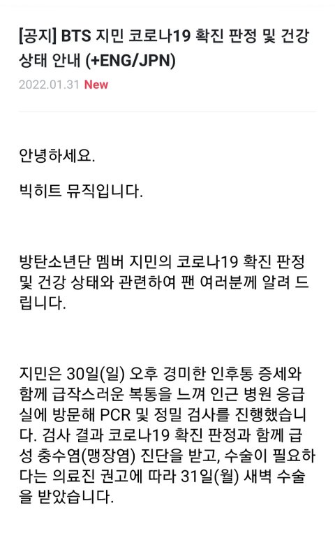 지민이 맹장염이랑 코.로나 공지