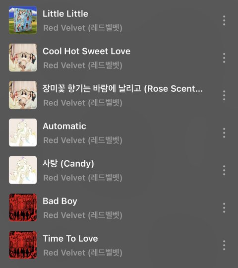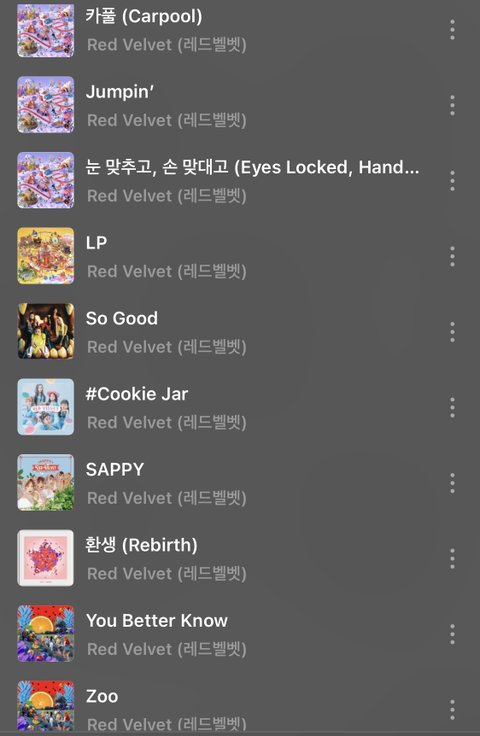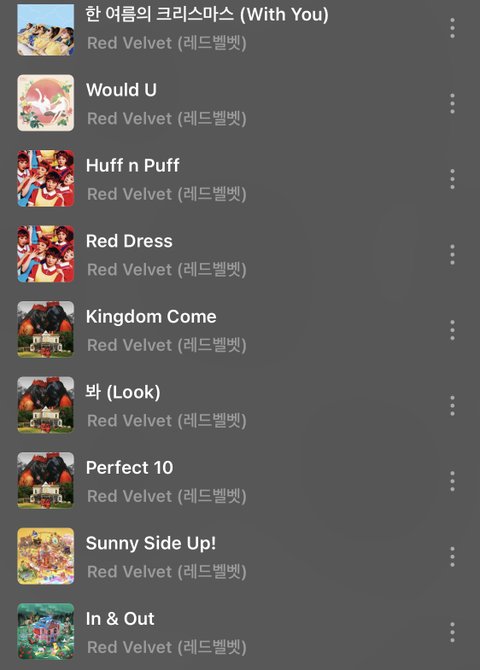 + 레벨 전곡 웬만하면 다 알아서 댓글에서 이거 왜 없냐는 곡들도 다 아는 노래야.. 다만 내 취향이 아닌 ㅎㅎ.. 플리에 없다구 너무 뭐라하지 말아주랑 나도 너희가 추천해주는 곡들 넘무넘무 조아..❤️ 추천도 고맙구..❤️ 갑자기 관심 받아서 부끄럽지만 모두 레드벨벳 노래 다 들어주고 사랑해주라 판녀깅들 새해복도 많이 받궁!!!