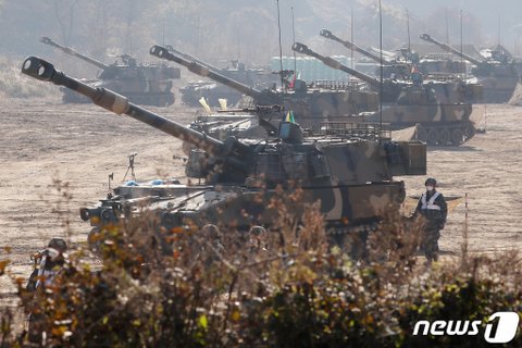 (사진 설명) (파주=뉴스1) 민경석 기자 = 25일 경기도 파주시 접경지역의 한 훈련장에서 포병부대가 자주포 사격훈련을 하고 있다. 2021.10.25/뉴스1