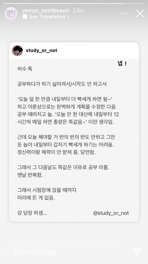 진짜 특 :이런 공부 자극 개지리는 거 봐도 자극만 받았지 실천하는 건 없음. 어차피 바뀌는 건 없을텐데 “아 진짜 내일부턴 공부 개빡세게 한다~” 라고 생각하며 하던 핸드폰을 계속함. 고등학교 3년 내내 이런 식으로 어영부영 살다가 지잡대 엔딩. 하지만 지잡대에 가서도 바뀌는 건 없음ㅋ