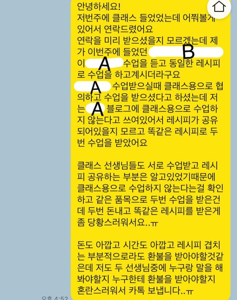 그래서 바로 B선생님에게 다른클래스와 레시피가 똑같은데 어떻게 된걸까요 하고 여쭤보니 B가 A에게 수업을 듣고 똑같은 레시피로 수업을 하는거였습니다