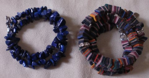 칩 스타일의 다양한 모양으로 된 내추럴한 청금석 팔찌와 가죽 패치를 여러겹으로 덧붙여 사각형 모양으로 타공하여 제작한 목걸이 겸용 가죽 팔찌입니다.(마디샤)