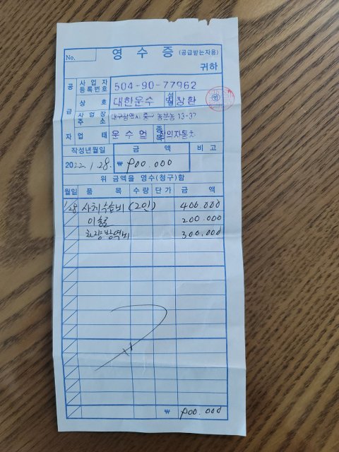 명함과 영수증을 받아보니 이송업체가 대한xz 박창x대표, 강동x 부장으로 확인하였습니다.