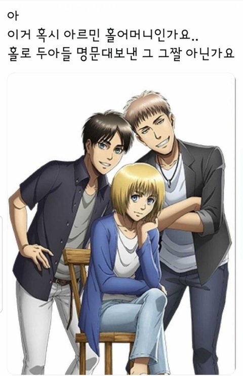 쟝이랑 에렌은 서로 붙지 말고 떨어지라면서 으르렁대고 싸우고 있고 아르민은 둘 말리면서 안절부절 못하고 있는데 카메라 셔터 소리 들리면 둘 다 자기가 젤 잘생긴 줄 알고 누가 더 잘 나오는지 대결하는 것 같이 딱 포즈 짓고 사진 다 찍고 또 싸울 것 같음
