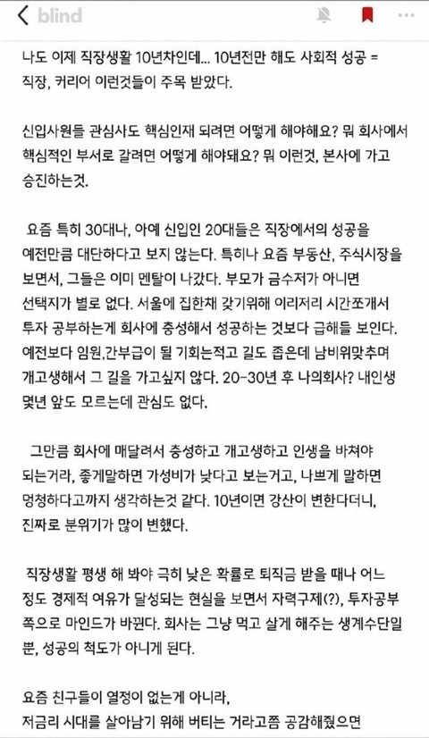 충성해서 높은 자리 올라가겠다 x 일단 먹고살고 투자할돈 모으겠다지 옛날같이 말단사원 사장 신화 이런거 없잖아? 그 기득권들이 내어주겠냐고...