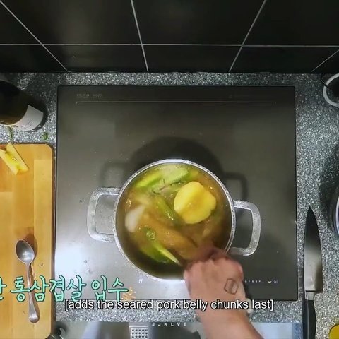 ⑩ 육수가 끓으면 불 줄이고 시어링한 통삼겹살 다시 입수